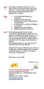 Wir gestalten Vormittage gemeinsam mit Lächeln, Sprechen, Basteln, Ausflüge in die Umgebung, Kennenlernen von Kultur in Deutschland, Kochen und vieles mehr.
